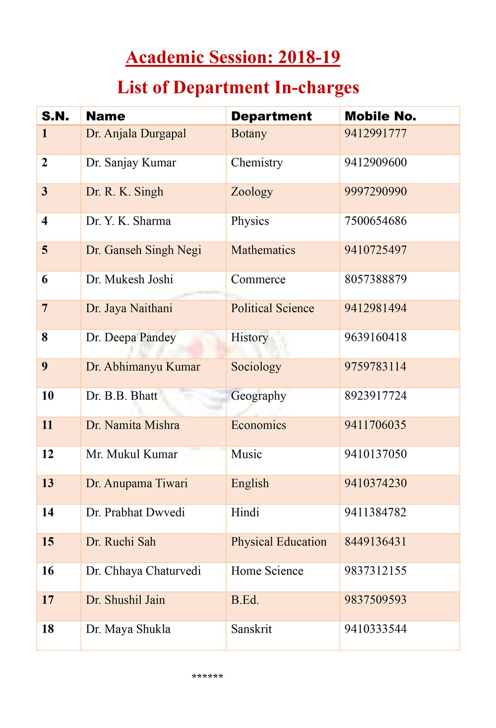 List of Department In Charge